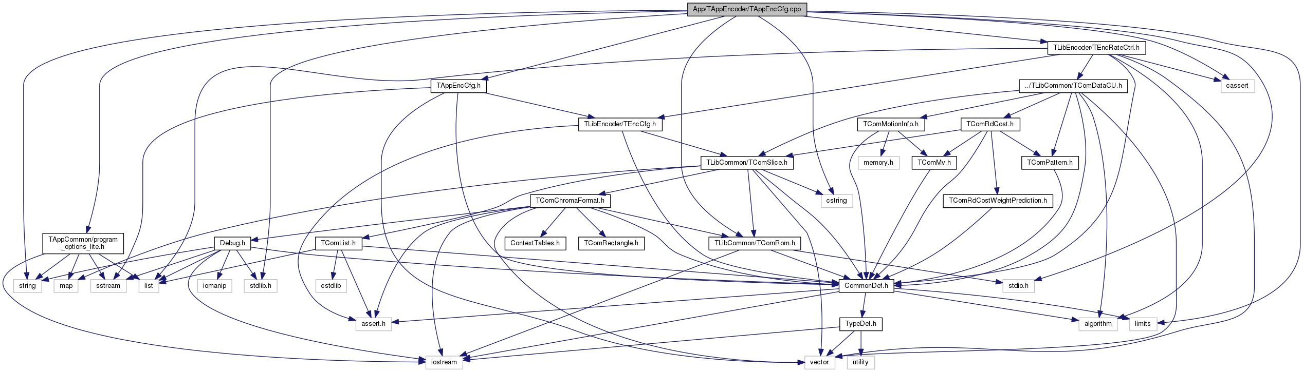 #include <stdio.h>#include <stdlib.h>#include <cassert>#include <cstring>#include <string>#include <limits>#include "TLibCommon/TComRom.h"#include "TAppEncCfg.h"#include "TAppCommon/program_options_lite.h"#include "TLibEncoder/TEncRateCtrl.h"